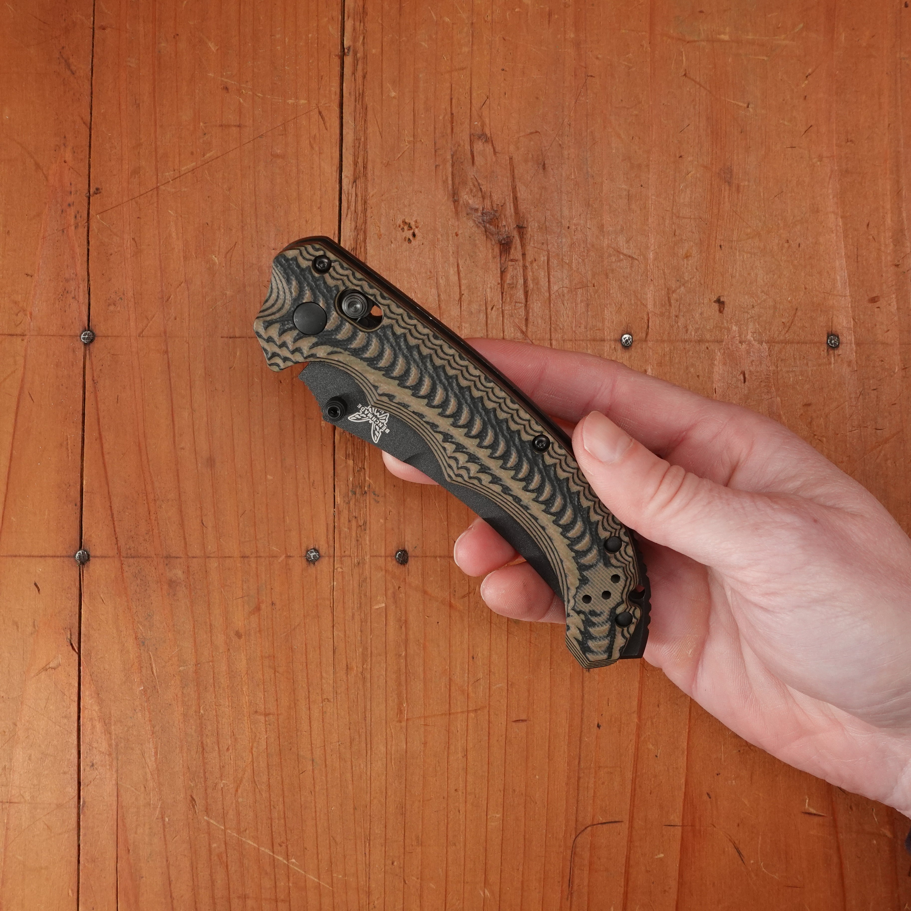 The 865BK-01 Mini Bedlam achieves a perfect balance between portability, tactical design, grip, and cutting performance.